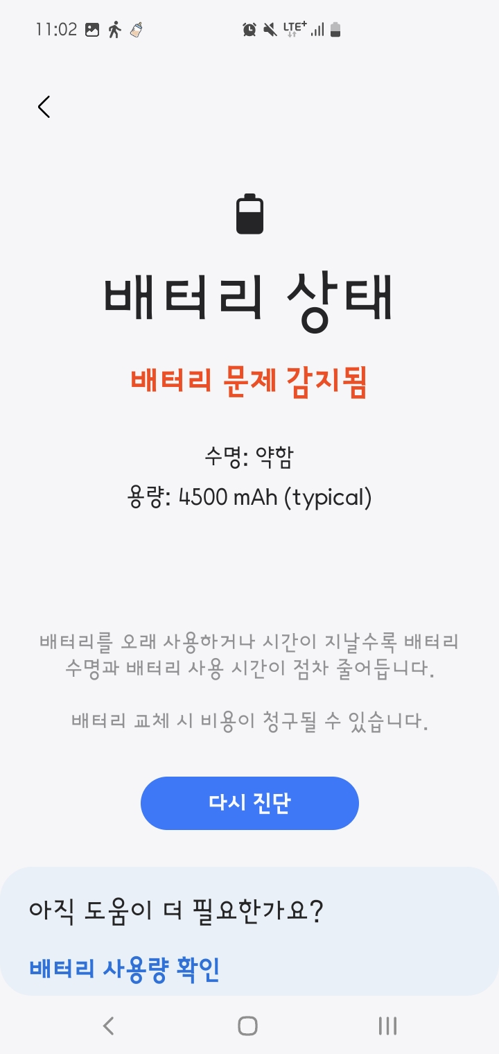 저는 핸드폰이 5년가까이 되어서 그런지 배터리 문제 감지됨으로 나오네요.